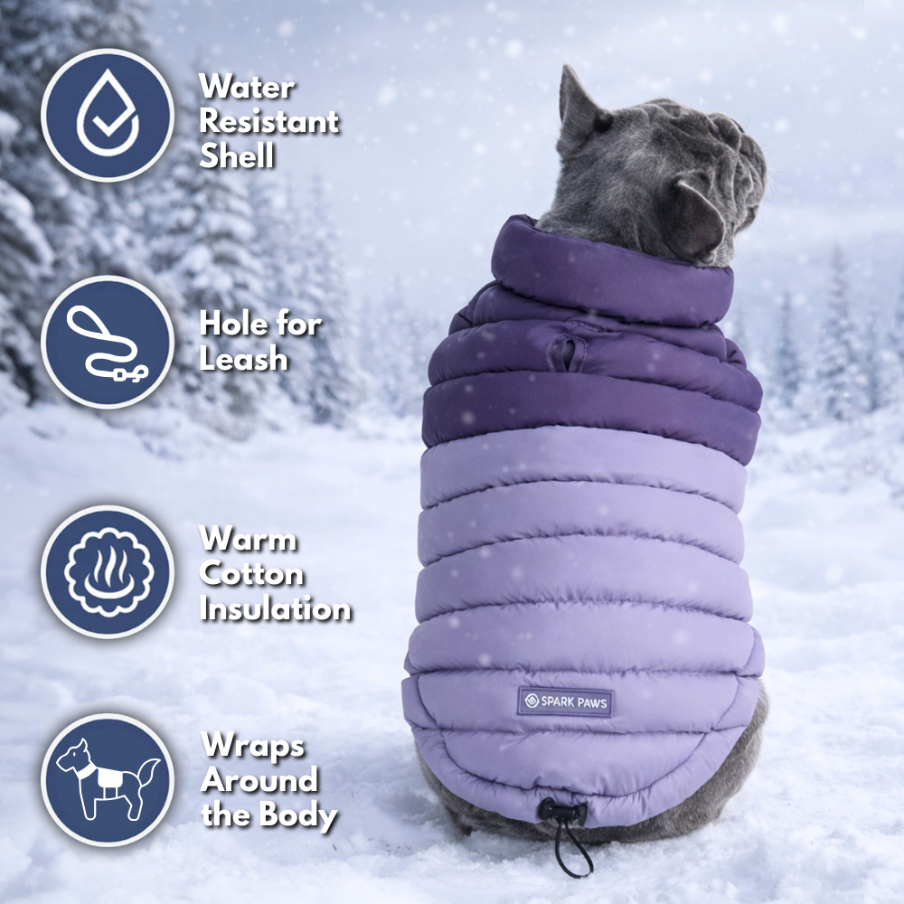 Migliora il guardaroba invernale del tuo cane con il cappotto invernale PuffShield. Unendo l'estetica nostalgica Y2K alle moderne prestazioni tecniche, questo gilet bicolore con collo alto è progettato per la massima praticità e per mantenere il tuo cane caldo e alla moda durante le passeggiate invernali.