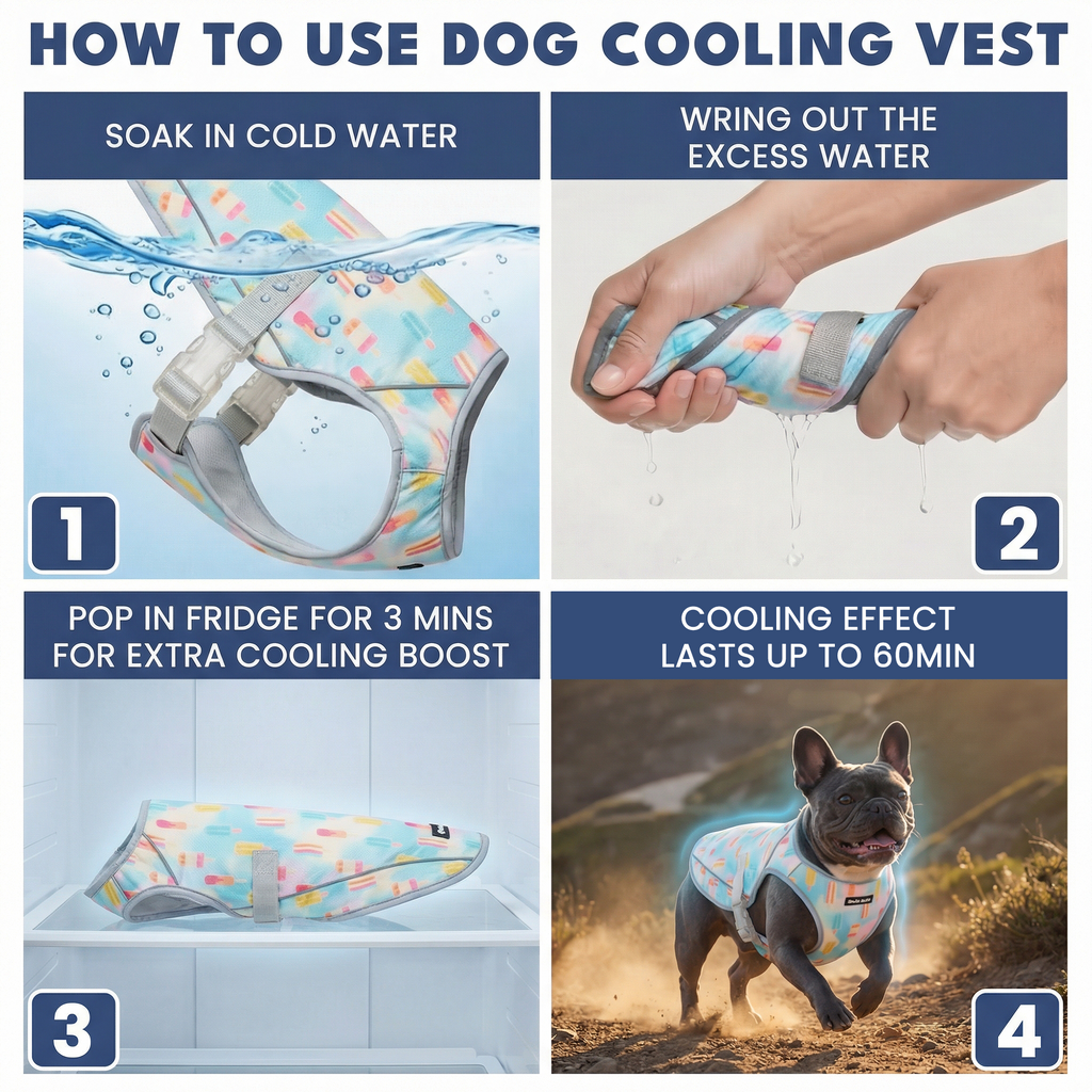 - Breng koud water aan voor een verkoelend effect, breng opnieuw aan zodra het vest begint te drogen