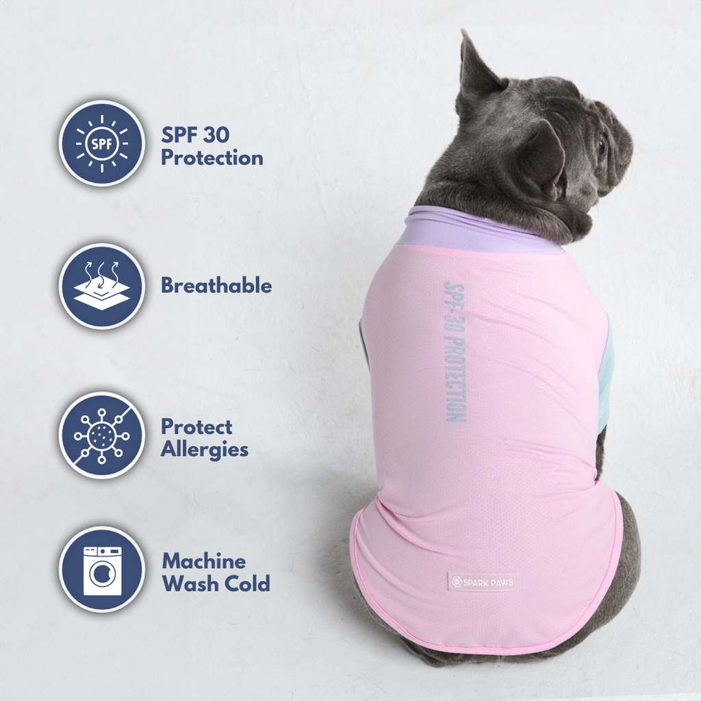 Protect your dog from the sun with our SPF 30/UPF 30 Sun-Block Dog T-Shirt, blocking 96%+ of harmful UVB rays while keeping your dog clean and allergen-free.